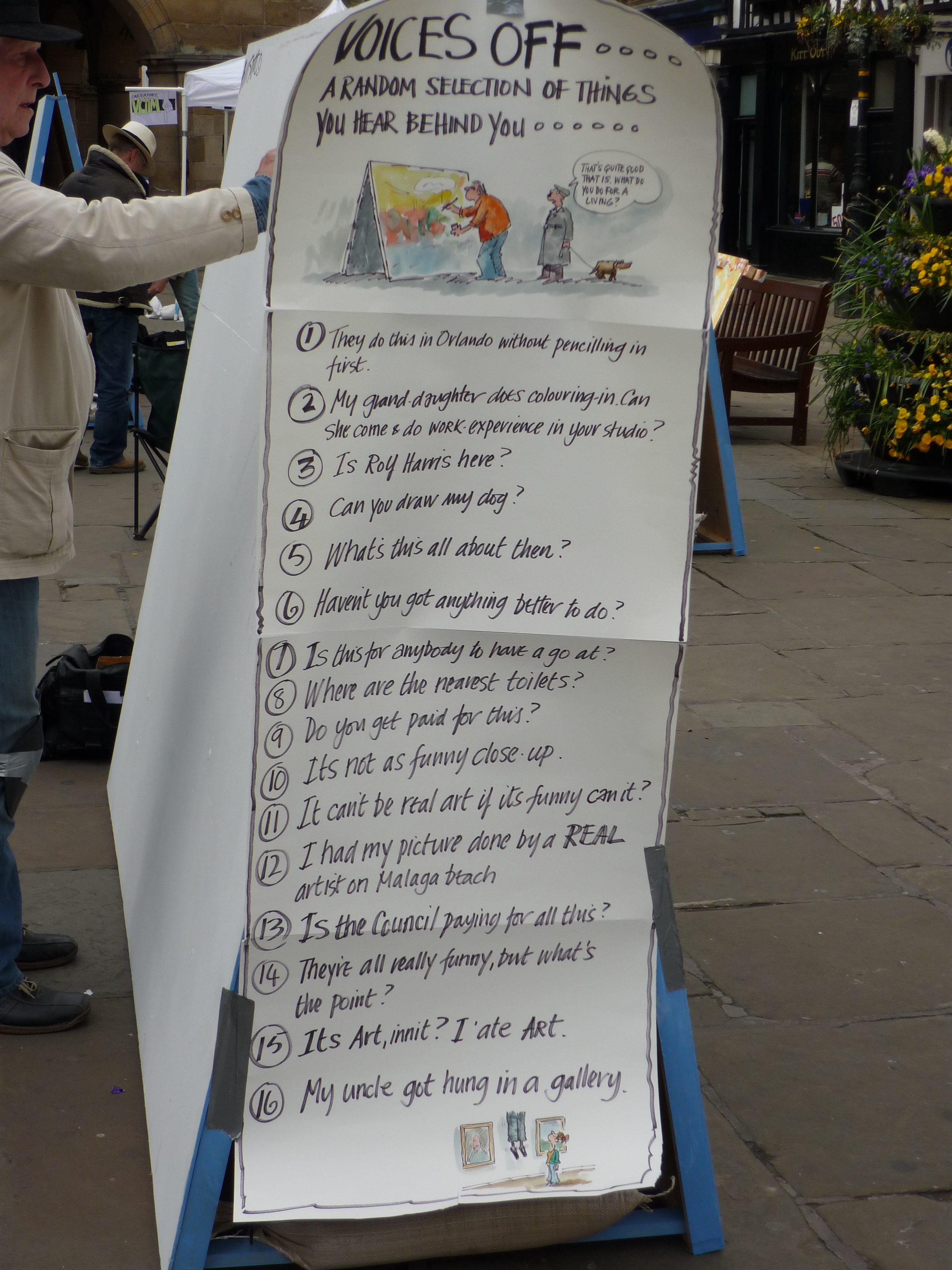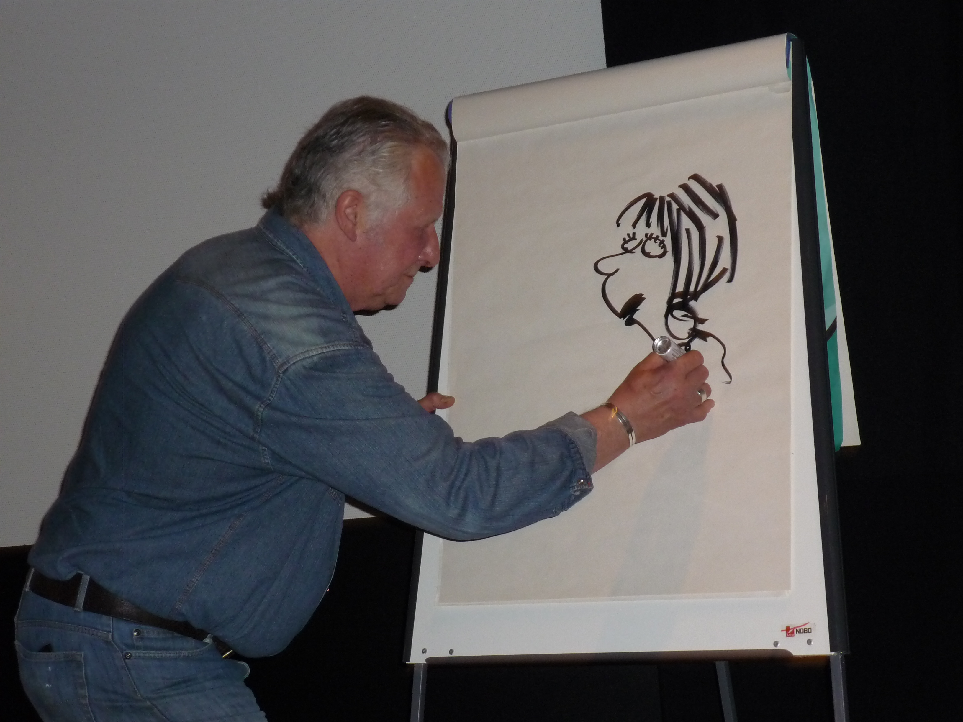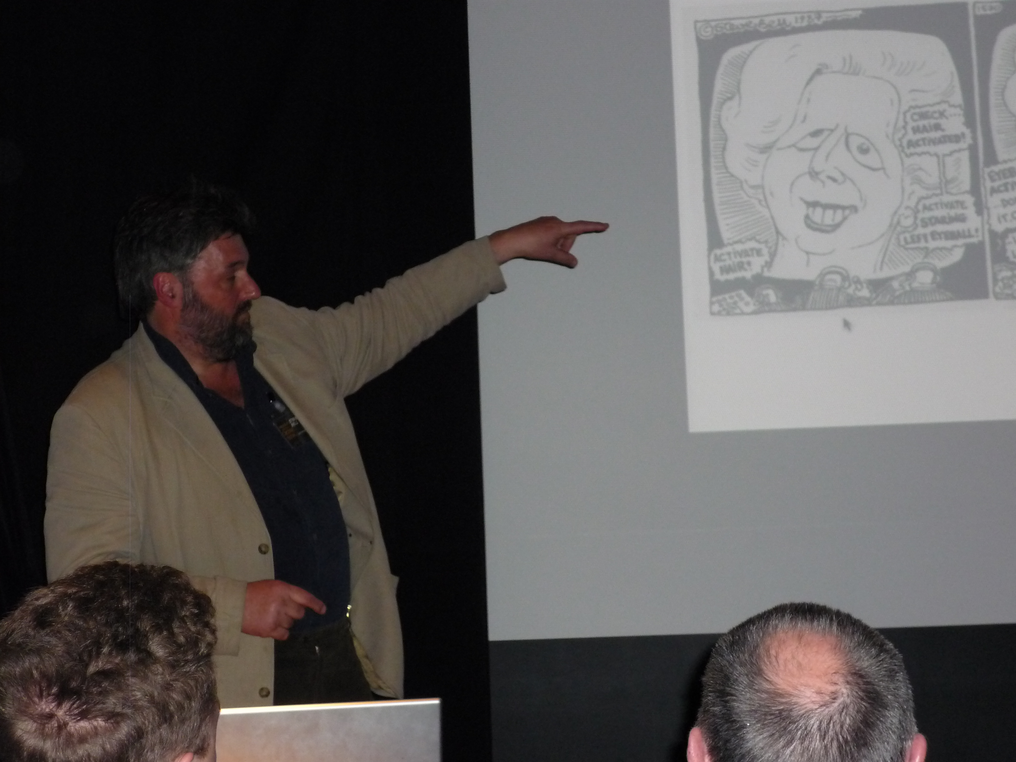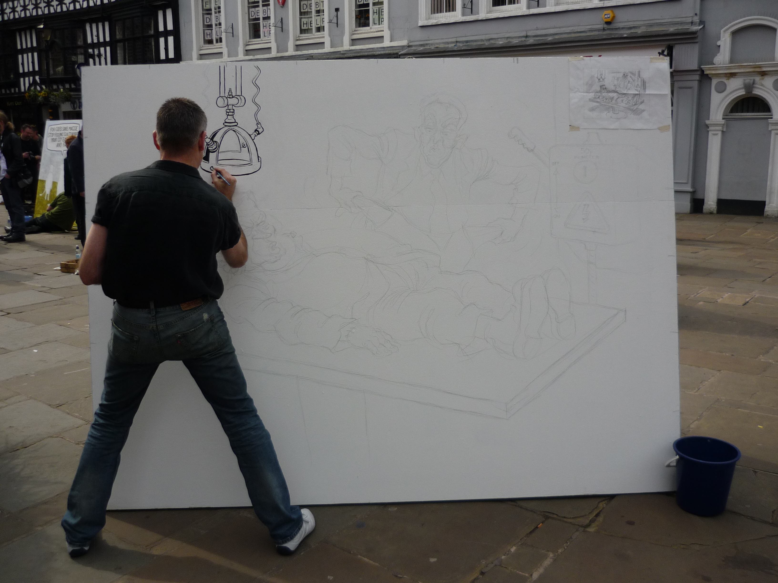 Saturday’s weather forecast meant the appearance of the marquee to cover the Big Boards in the main Square, but this didn’t proved necessary in the end. Daytime events on Saturday included talks, workshops and cartoon clinics. Whilst Matt and Royston went off to cover some of the other events, I settled myself in at the Old Market Hall for talks by Bill Stott (on The Science and Philosophy of Serious Ranting – and very funny) and Steve Bell who, amongst other things, thanked me publicly for my eyebrows. You see, the thing is Steve was struggling with his caricature of Barack Obama, but it only clicked for him when he saw my rendering of him (here’s Steve’s before and after for an example) in Tribune. Saturday night closed with the usual bacchanalian shenanigans of the cartoonists’ and organisers’ dinner, of which the less said is probably better.