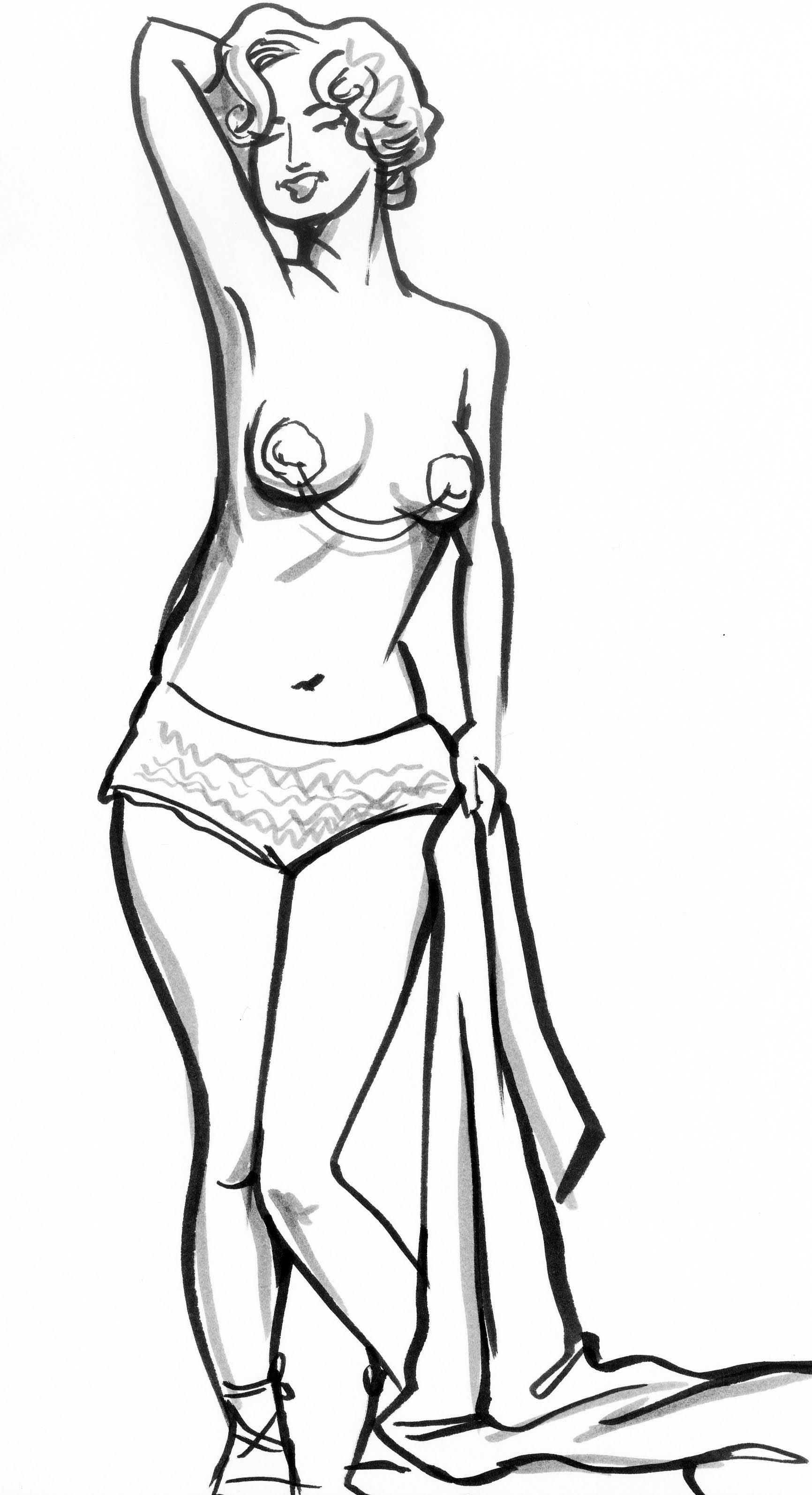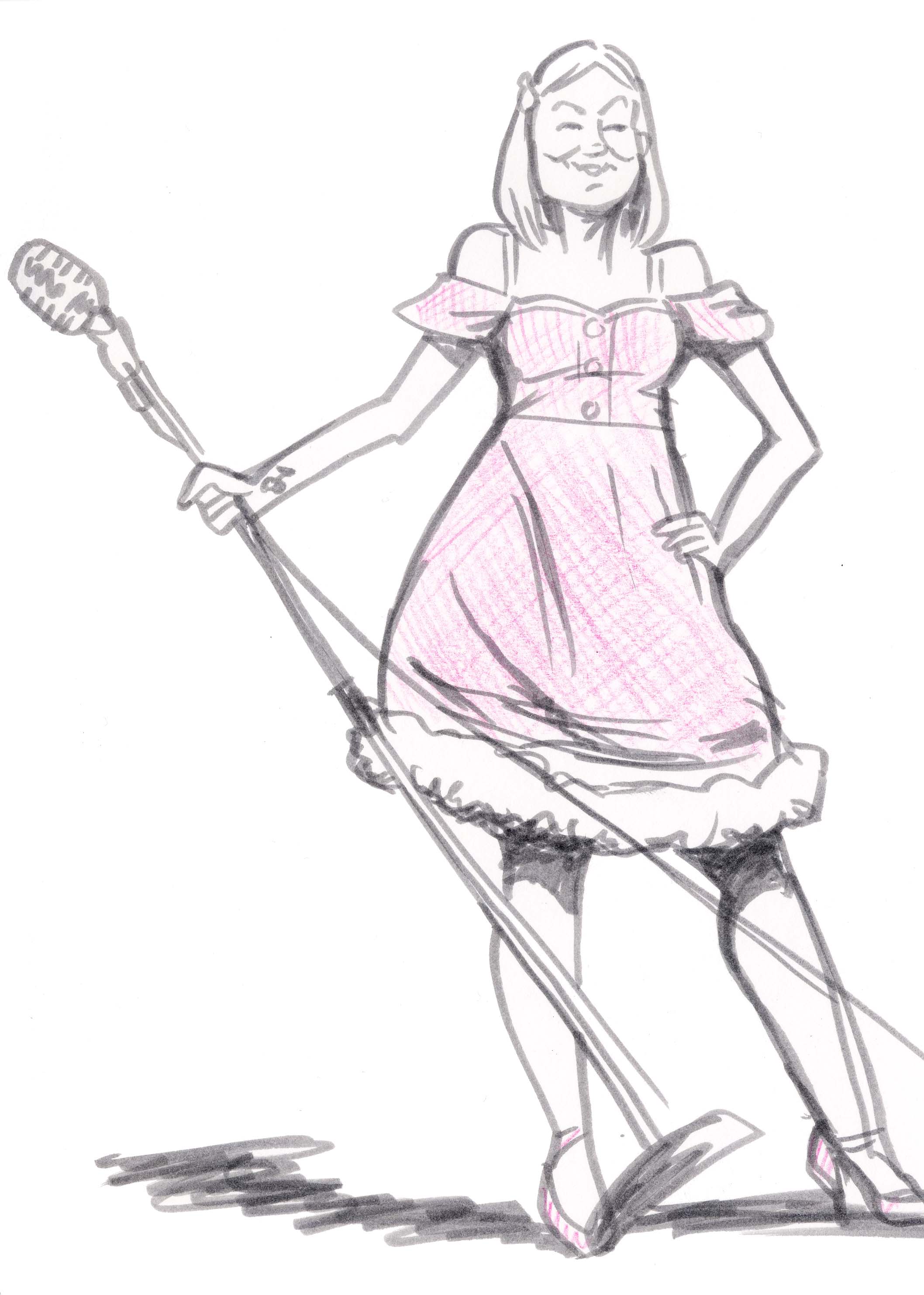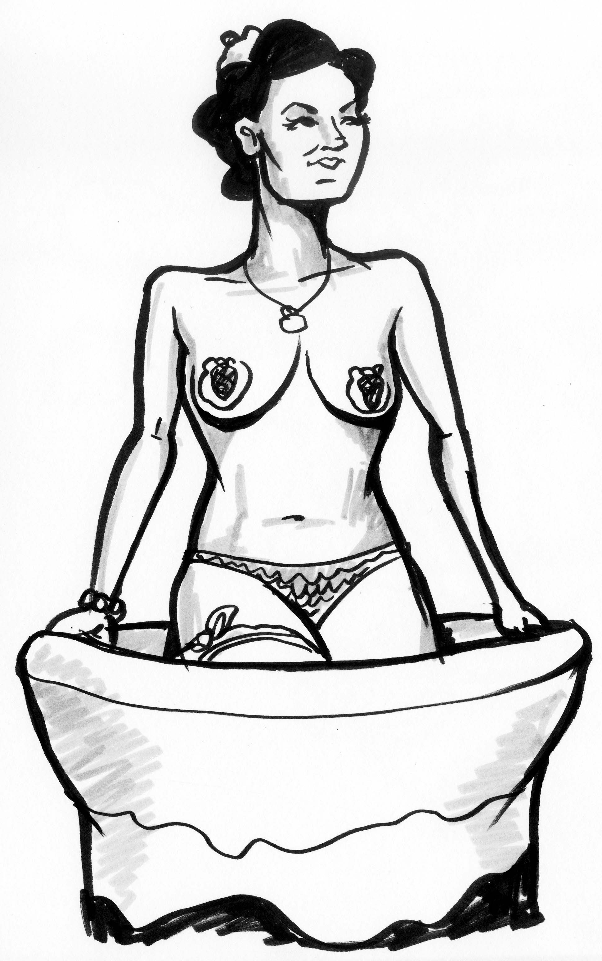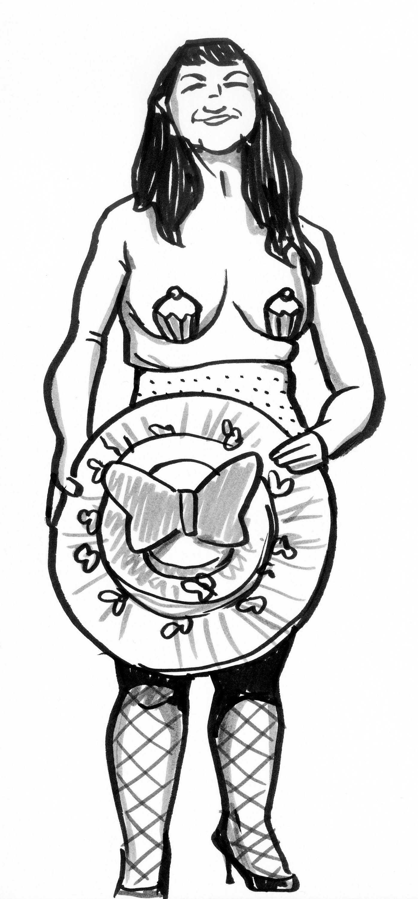 Suzie Sequin brought Hollywood glamour to proceedings (as she had at a previous Dr Sketchy’s), this time perfoming to Marilyn Monroe’s infamous rendition of Happy Birthday, Mr President. Cherry Fox returned for her second song of the evening, Lesley Gore‘s It’s My Party (probably better known in this country by it’s 80s cover version by Dave Stewart and Barbara Gaskin). The final set of the night was Sherry Trifle performing, er, How to Make A Sherry Trifle (and yes, there was whipped cream…). After posing for one set, Sherry returned for our last pose alongside the Decadent Gent and Ditzy Diamond.