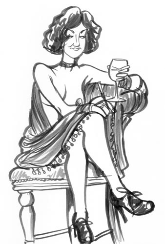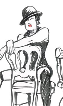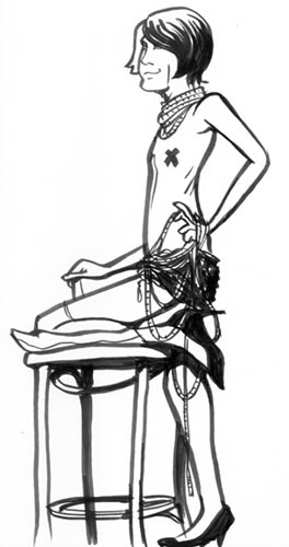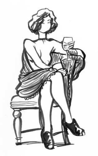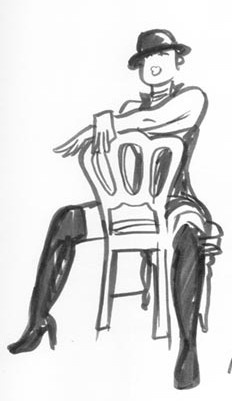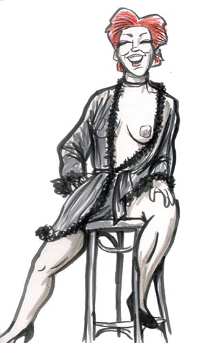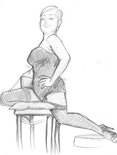 Berlin also marked the first appearance by new host Liberty Pink who welcomed us by singing Willkommen and a short pose. Dr Sketchy’s regular Cherryfox was up next, dancing to Pulp’s This is Hardcore and posing with wineglass and cigarette holder. Following her appearance at the previous Victoriana-themed night as Fanny Malone, Crimson Skye returned to pose again, and we had a further pose from Sketchy’s newcomer Lulu La Rocca in a distinctly Sally Bowles-esque bowler-hatted outfit, although no performance. Rounding up proceedings, and performing to another Caberet song, Money, was, unusually, male burlesque dancer Mr Mistress and a heck of a lot of glitter.