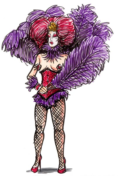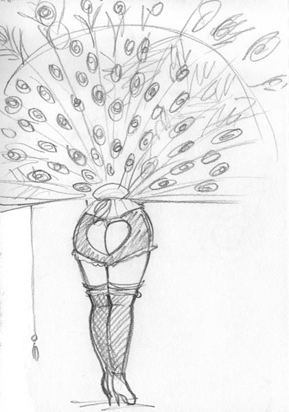 Liberty Pink returned with her rendition of the Scarlet Pimpernel from the musical of the same name, before posing with stage manager Tiffany Beau. Another elaborate wig was being sported by the next act, Kitten von Mew, complete with twinkly fairy lights and a peacock feather tail. She then went on to pose for two drawings, one of them rather ‘cheeky’.