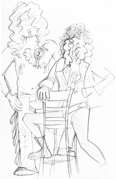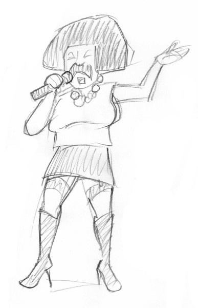 Liberty Pink, in a manly t-shirt and shorts opened the show with an 80s-tastic performance that combined Ultravox’s Vienna, Bananarama’s Venus and, ahem, Sam Fox’s Touch Me. Next up was a surprise guest appearance by US songstresses Christina Aguilera and Cher (although I suspect it wasn’t actually them – judge for yourself from the sketches below) showing off their baked goods. No euphemism intended – their cakes were entries for the Great Sketchy’s Bake-Off. They are clearly very competitive… there may be trouble later.
