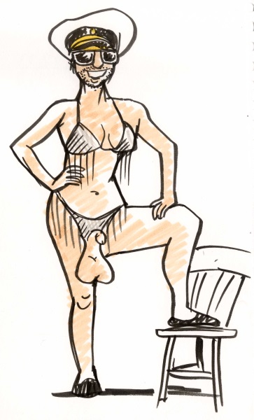 With the tone now set for silly, Liberty Pink returned in moustache and fedora for her musical tale of the lothario Alfonso. The next act was billed as Sketchy’s regular Crimson Skye, but sadly she was unable to make it. Luckily though, her friend and sometime Chippendale-alike Duncan Donut gamely stepped in and dressed in full Officer and a Gentleman uniform stripped to Peter Gabriel’s Sledgehammer. I have my suspicions about Duncan and Crimson’s relationship though…